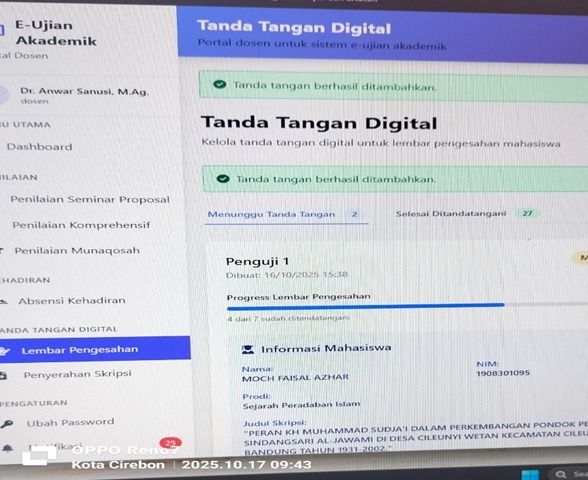Cirebon, 17 Oktober 2025 — Fakultas Ushuluddin dan Adab (FUA) UIN Siber Syekh Nurjati Cirebon mengadakan sosialisasi penggunaan Aplikasi Digitalisasi Lembar Pengesahan dan Persetujuan Pasca Sidang Munaqasyah sebagai bagian dari implementasi transformasi digital kampus.